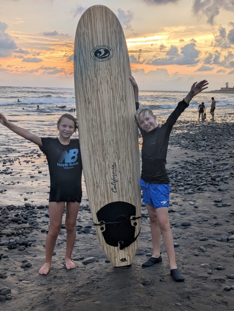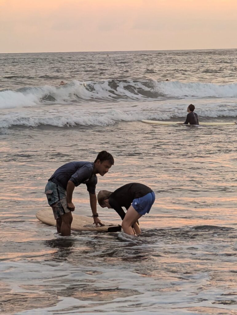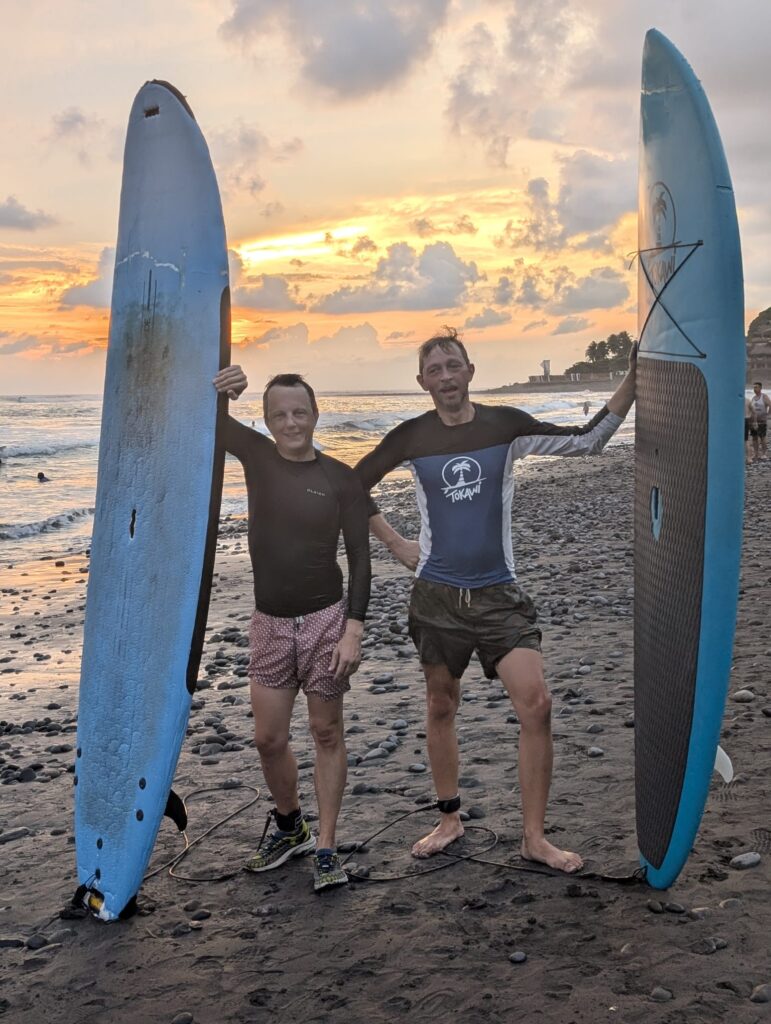 Once again, we booked afternoon lessons — having learned from last year’s experience that the waves are much gentler for beginners at that time. It’s an incredible feeling to surf when the sun is low, enjoying not only the warm ocean water but also the golden glow of the sunset reflected on the waves.