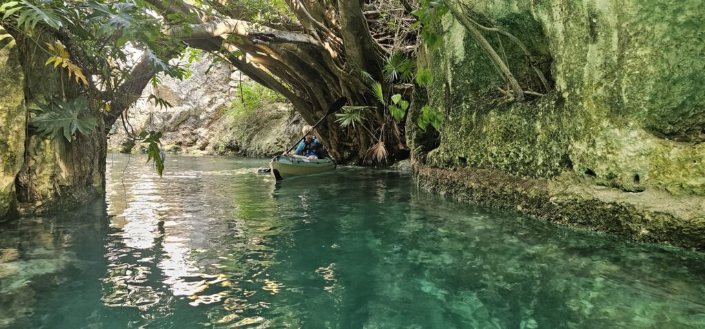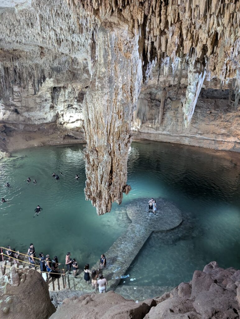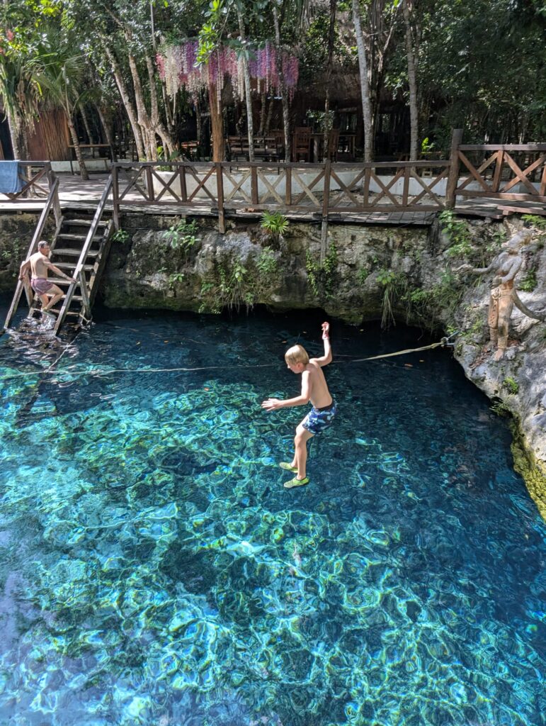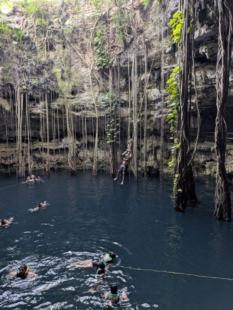 Another major attraction across the peninsula are cenotes — natural formations created by the erosion and collapse of limestone, revealing water from underground rivers. For the Maya, they were not only a vital source of drinking water but also sacred places connecting the earthly world with the underworld. All the cenotes we visited were open for swimming, with water temperatures around 24°C. Some offer additional attractions — jumping into the water from rocky platforms, swinging from a rope like a vine, or even zip-lining into the cenote.